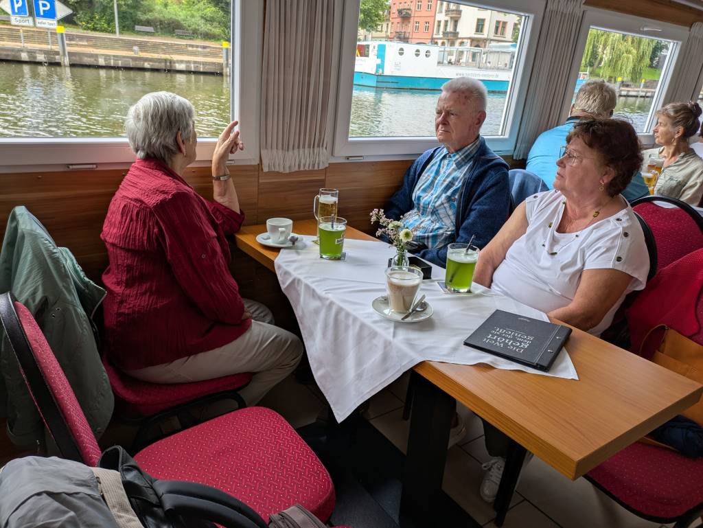Die Tour führte über die ruhigen Gewässer der Havel, vorbei an vertrauten Ufern und grünen Inseln, die selbst durch die Regentropfen ihren Reiz nicht verloren. Während das Wasser draußen gegen die Scheiben prasselte, wurde drinnen gelacht, erzählt und Erinnerungen geteilt. Für alle war es eine willkommene Abwechslung vom Alltag – einfach mal rauskommen, gemeinsam etwas erleben und neue Eindrücke sammeln.