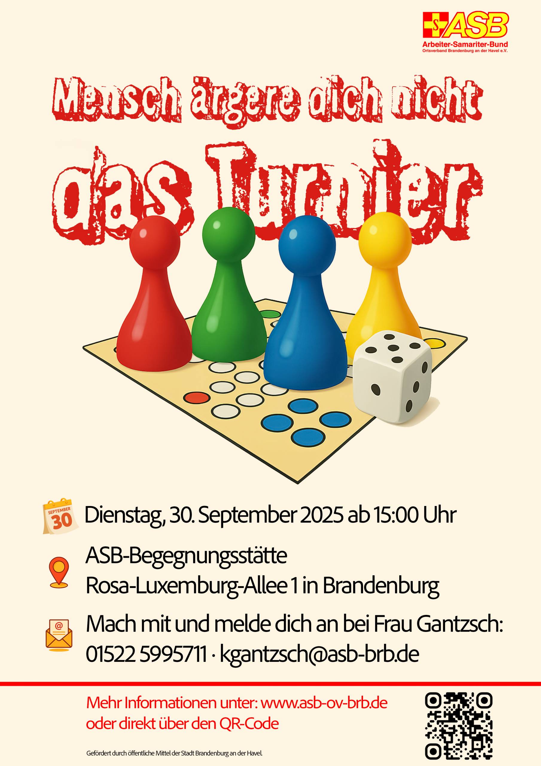 Der ASB lädt herzlich ein zum großen Mensch-ärgere-dich-nicht-Turnier in der Begegnungsstätte Brandenburg an der Havel.