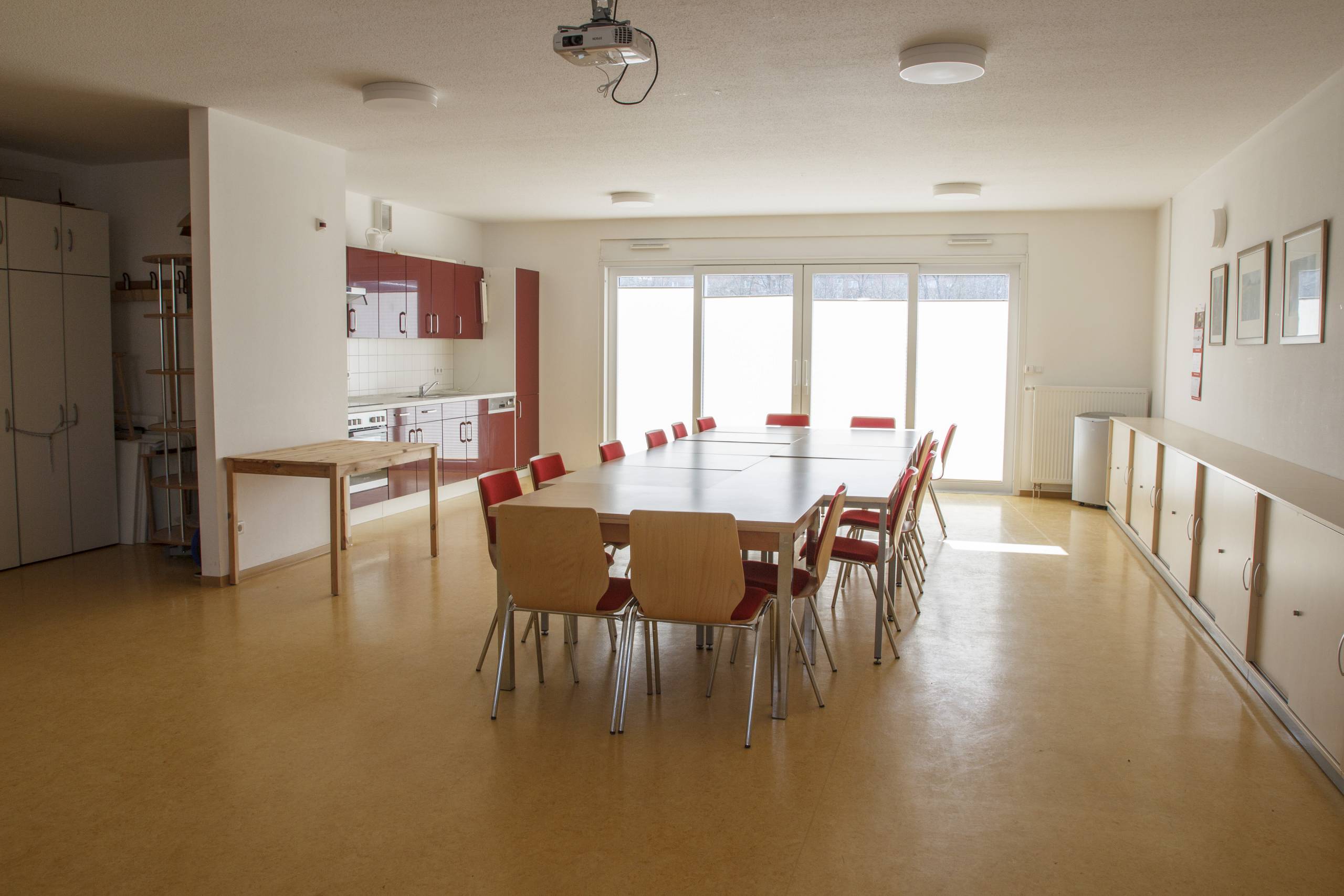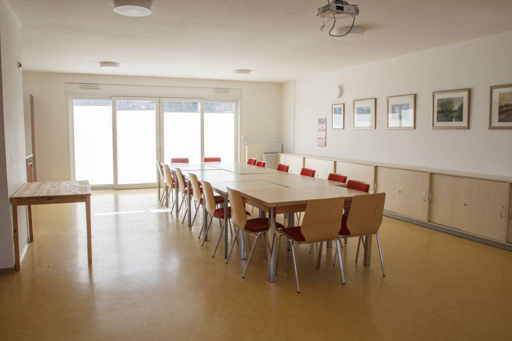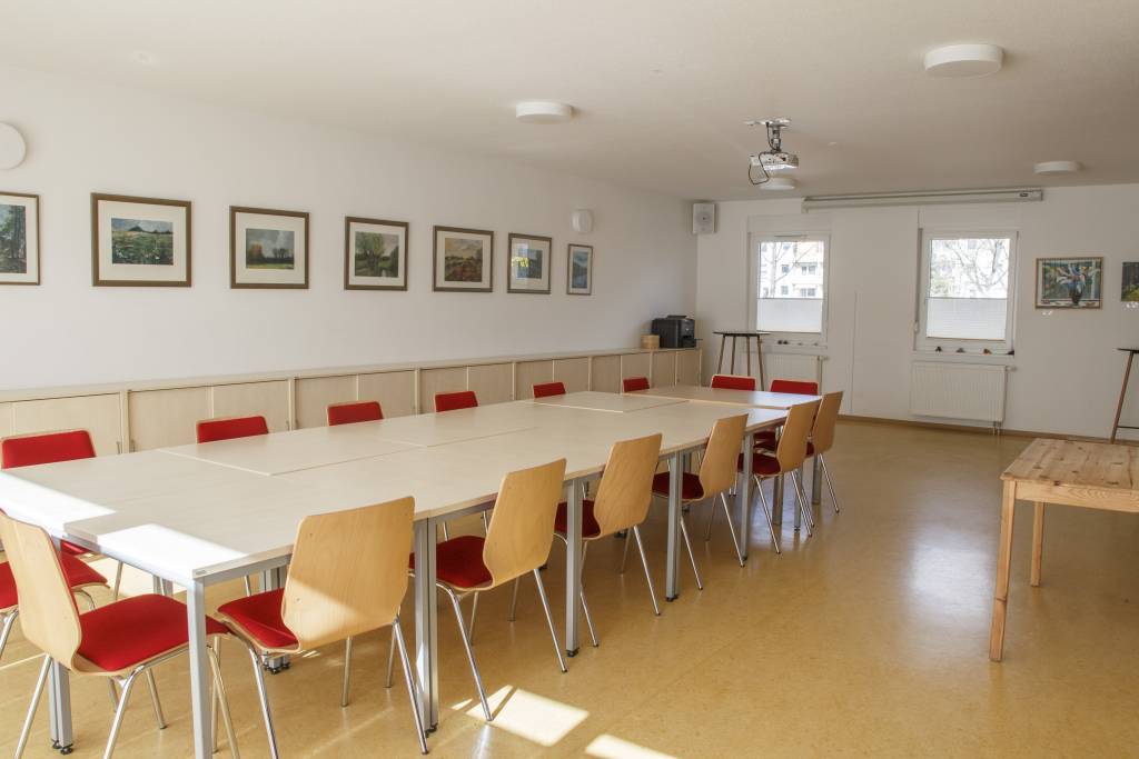Dank der offenen Raumstruktur lässt sich der Raum je nach Bedarf für kleinere Gruppen, Sitzungen oder Feiern vorbereiten.